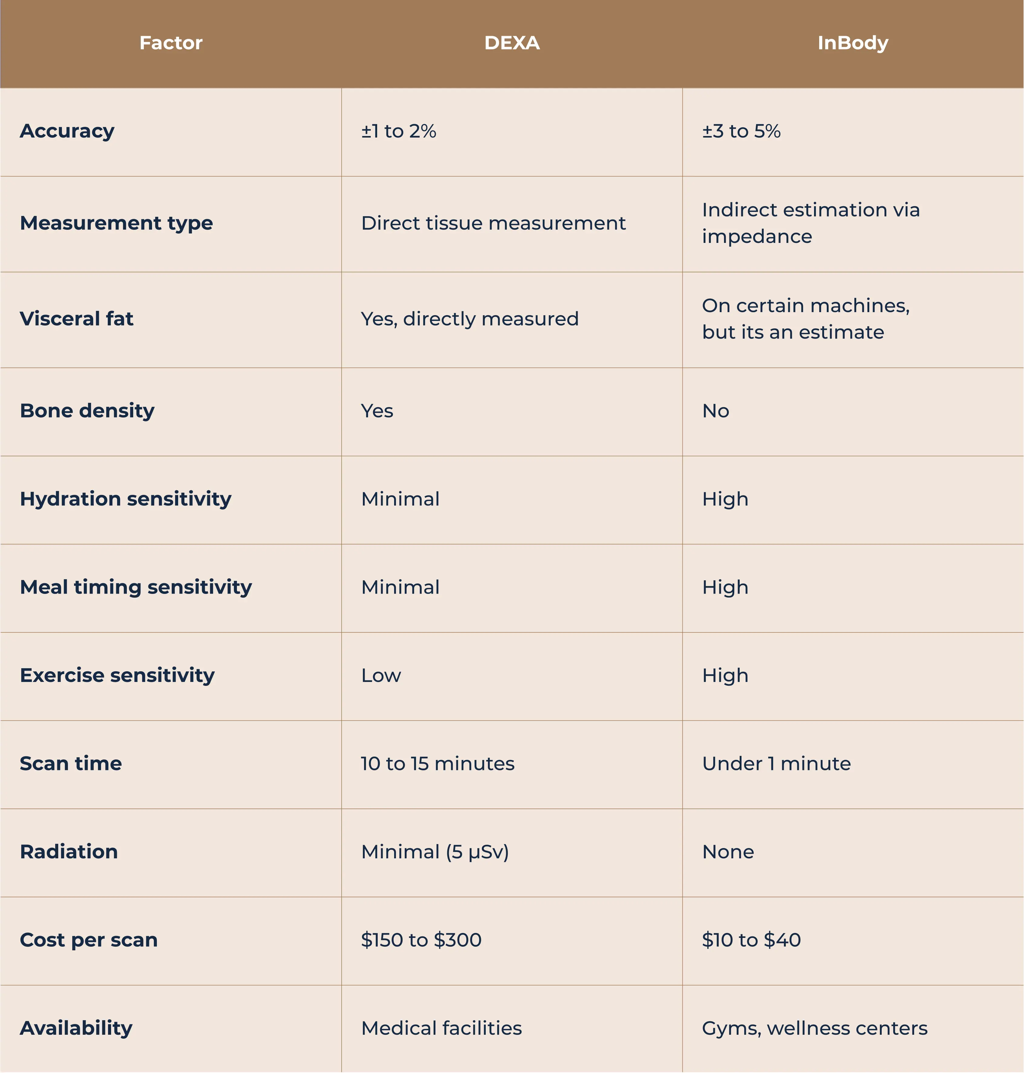 For routine progress tracking where relative changes matter more than absolute numbers, InBody can serve as a useful tool when testing conditions are standardized. However, for clinical decision-making, health risk assessment, or establishing accurate baselines, DEXA provides the precision that matters.